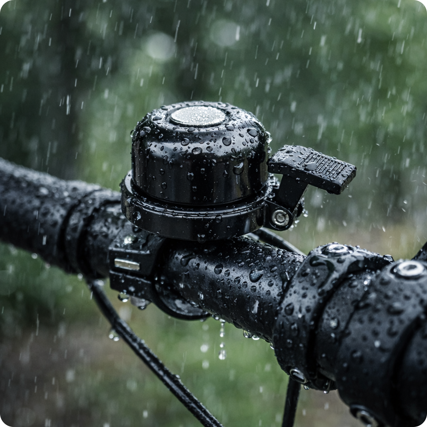 Dzwonek jest odporny na codzienne warunki użytkowania, w tym deszcz i wilgoć, dzięki czemu sprawdzi się zarówno podczas jazdy miejskiej, jak i dłuższych wypraw czy rekreacji na świeżym powietrzu.