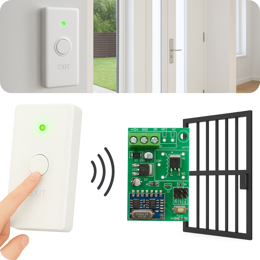 1. Bezprzewodowe sterowanie: Po naciśnięciu przycisku sygnał jest przesyłany do modułu odbiorczego, sterującego elektrozaczepem/modułem bramy czy innym urządzeniem.