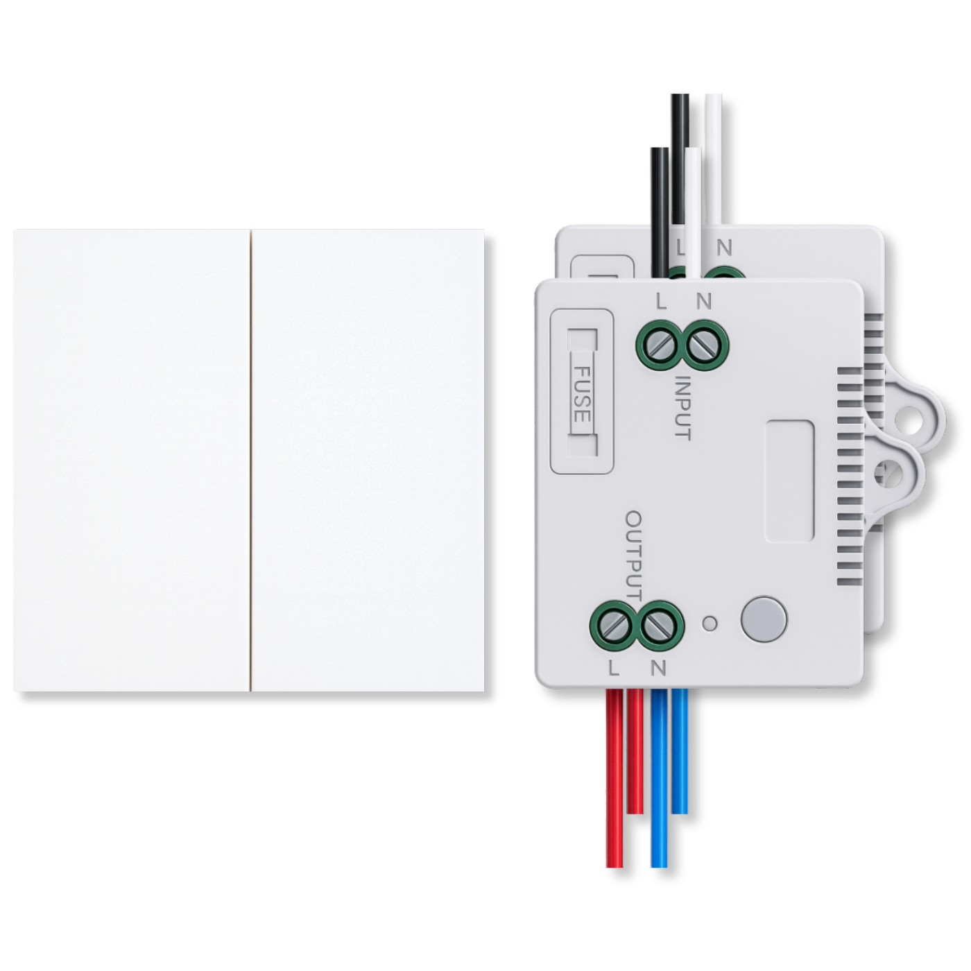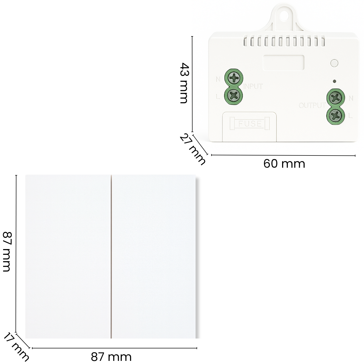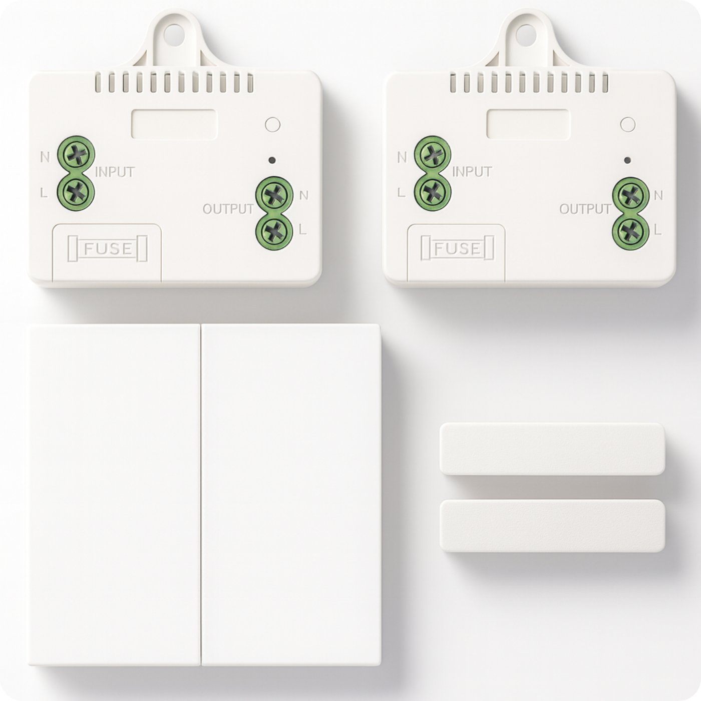 - 1 włącznik (2 klawisze) — wiele odbiorników: każdy klawisz może sterować niezależnym obwodem. Możesz więc jednym panelem włączać np. lampę główną i taśmę LED, albo światło w garażu i podjeździe. Instalacja sprowadza się do wsunięcia odbiornika pomiędzy zasilanie a lampę i umieszczenia panelu tam, gdzie Ci wygodnie.