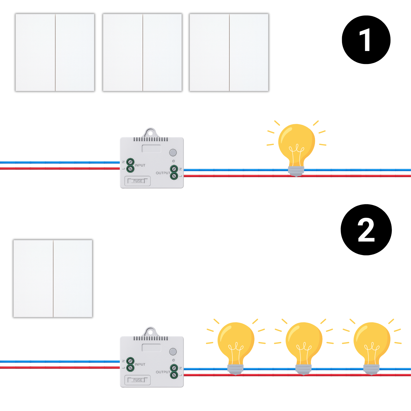 Jeden klawisz może równocześnie obsłużyć dowolną liczbę lamp, a odbiornik pamięta do 10 przełączników, dzięki czemu rozbudujesz instalację, kiedy tylko zechcesz.