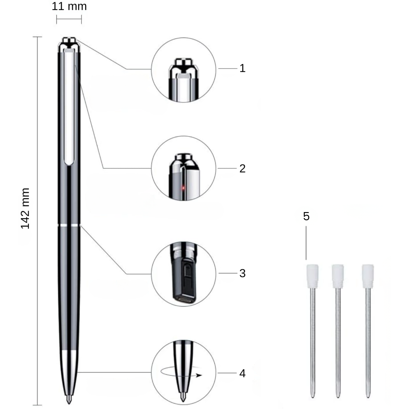 Prosty w obsłudze, z szybkim ładowaniem i eleganckim wyglądem, długopis jest idealnym wyborem do rejestrowania spotkań, wykładów czy rozmów, zapewniając pełną dyskrecję i wygodę.