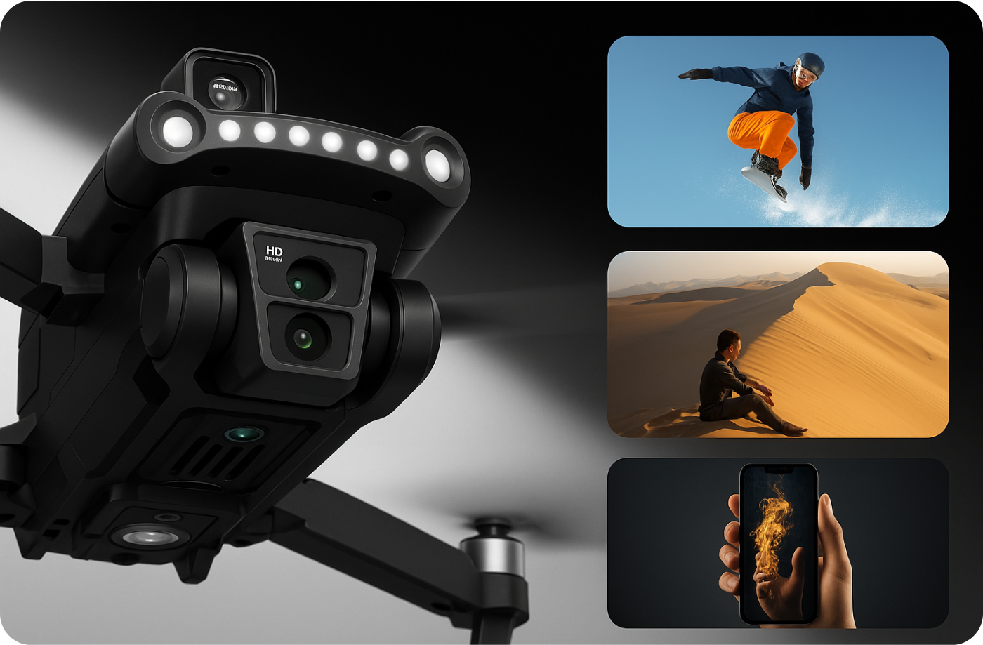 3. Oświetlenie LED: Wbudowane diody LED poprawiają widoczność drona podczas lotu w warunkach słabego oświetlenia, ułatwiają orientację w powietrzu i sygnalizują status urządzenia – idealne do lotów wieczornych i zwiększenia bezpieczeństwa.