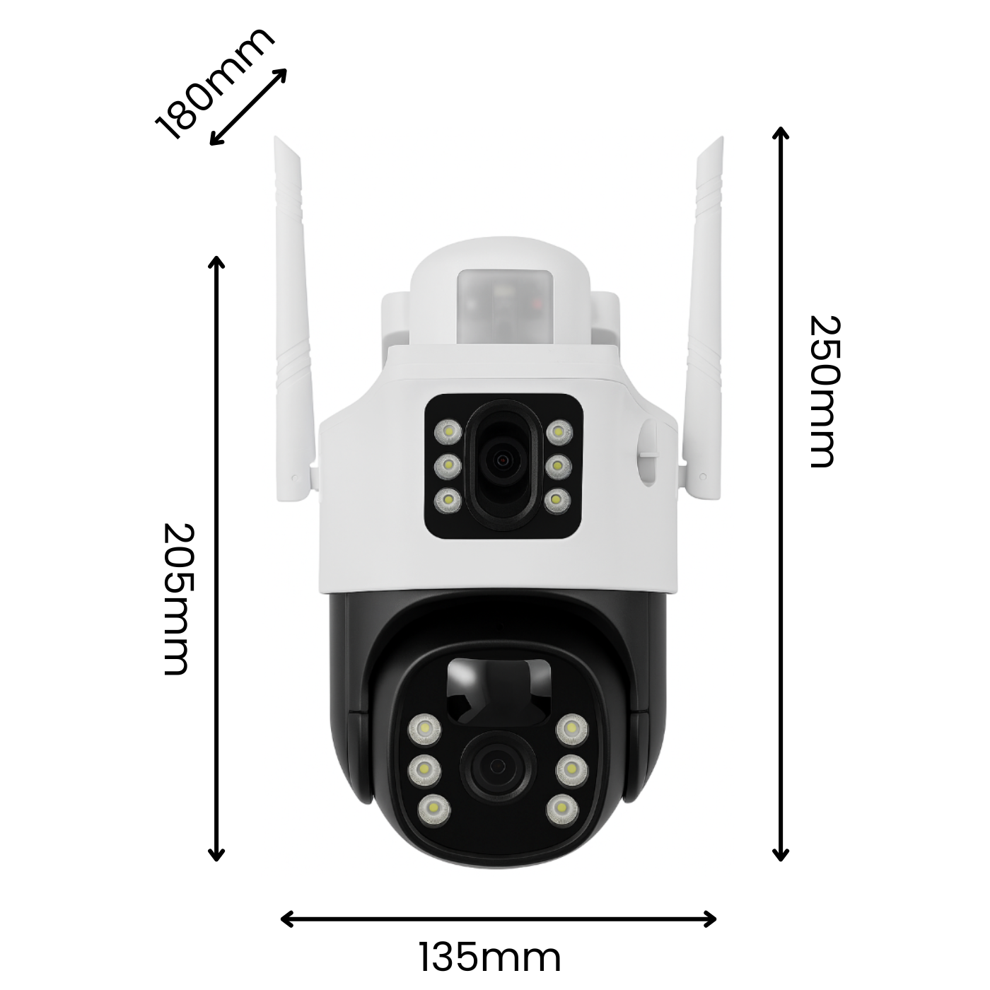 Dwumodułowa konstrukcja z wysokiej jakości obiektywami 3MP (regulowany manualnie obiektyw + obrotowa głowica z drugim obiektywem) umożliwia szerokie monitorowanie otoczenia, a wbudowane 16 diod LED wraz z sensorem podczerwieni gwarantują wyraźny obraz również nocą.