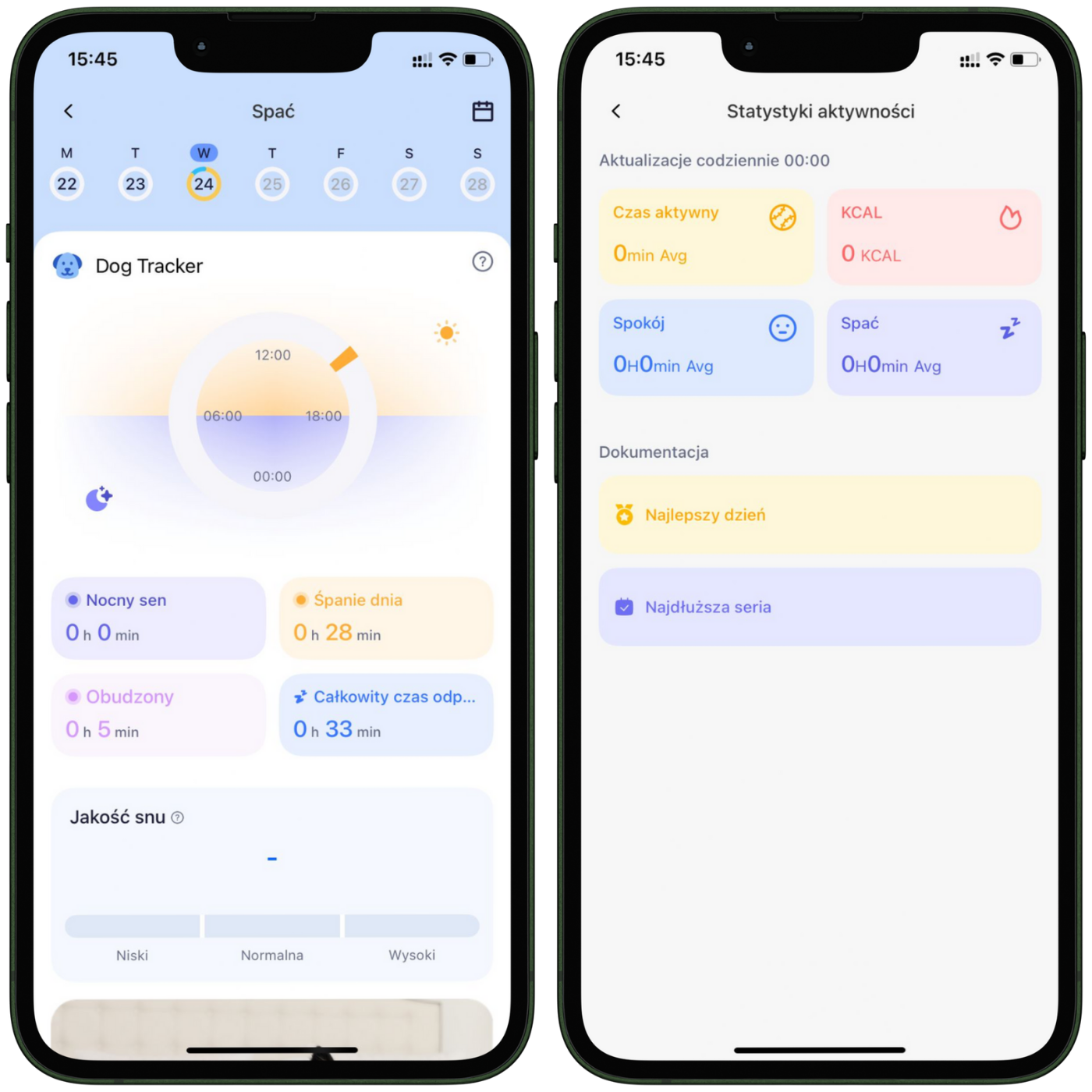- Statystyki aktywności i snu – codziennie aktualizowane dane pozwalają śledzić, ile Twój pupil się rusza, jak długo odpoczywa oraz jak wygląda jego rytm dnia.