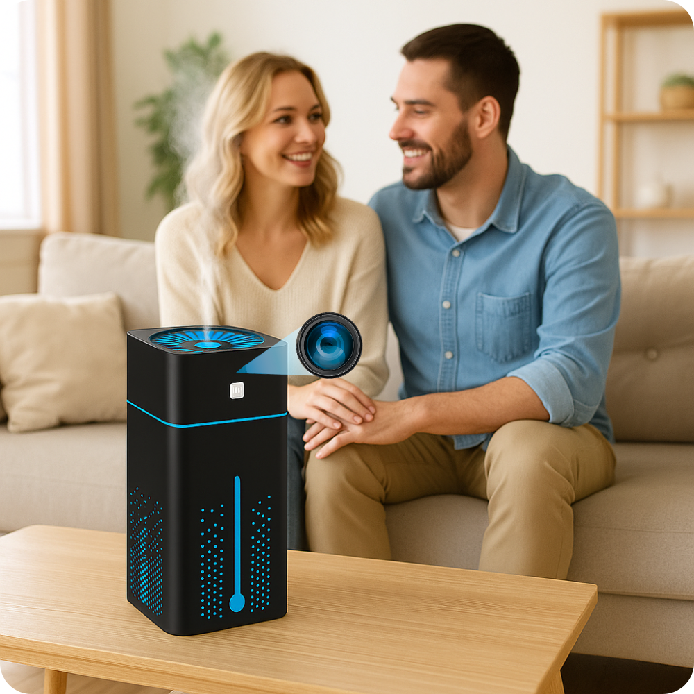 Sprytne połączenie nawilżacza z mini kamerą sprawia, że urządzenie wygląda jak zwykły element wyposażenia wnętrza. Wbudowana kamera jest praktycznie niewidoczna, dzięki czemu możesz dyskretnie monitorować mieszkanie, biuro czy pokój dziecka bez wzbudzania podejrzeń.