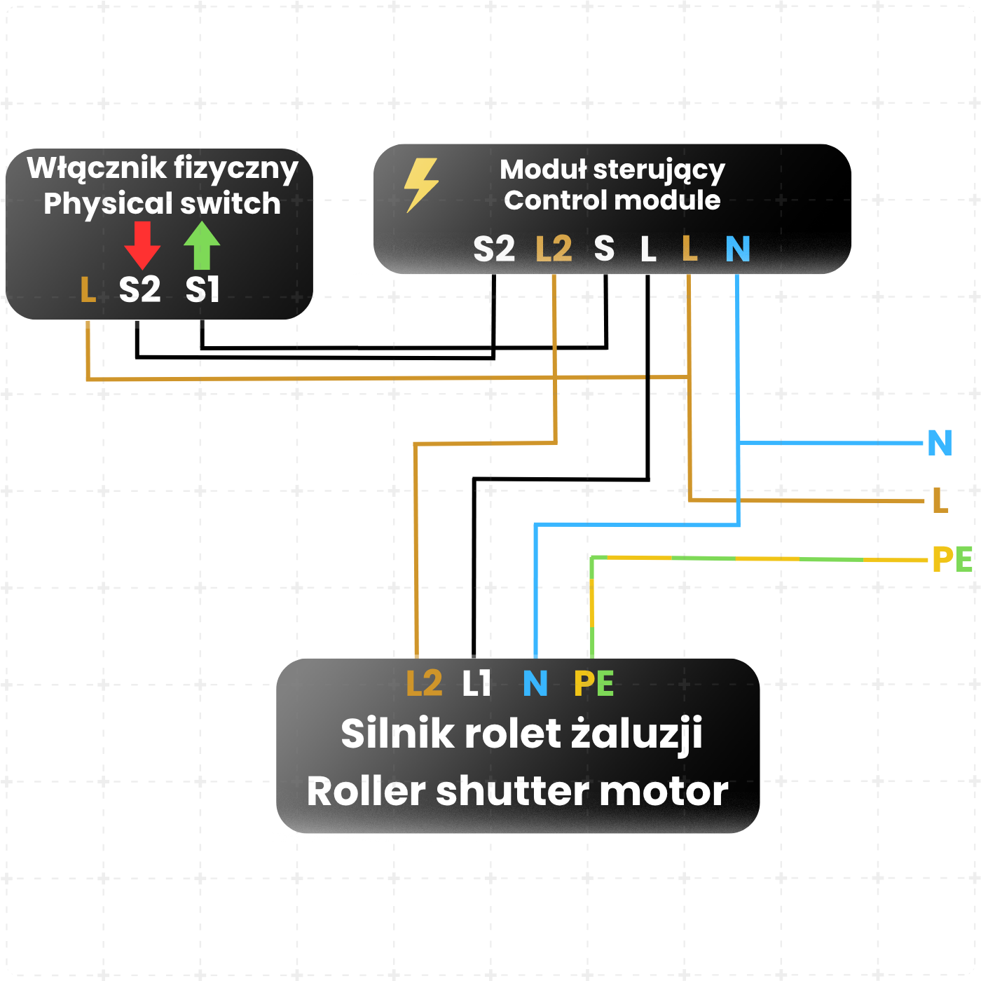 Urządzenie współpracuje z klasyczną instalacją elektryczną i wymaga podłączenia przewodu fazowego (L), neutralnego (N) oraz przewodów sterujących silnikiem. Możliwe jest również podłączenie zewnętrznego przełącznika (S1/S2).