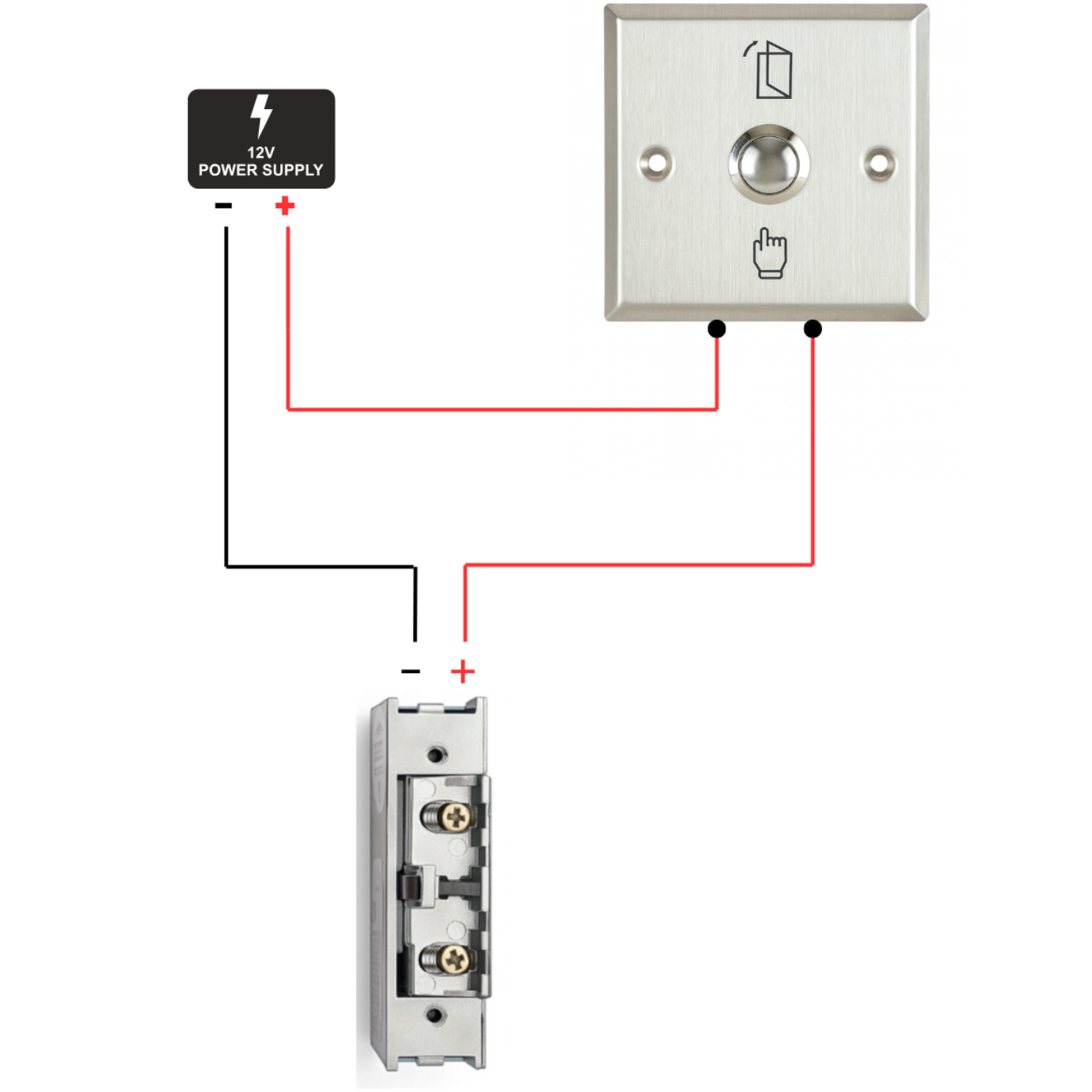 Po naciśnięciu przycisku obwód zostaje zamknięty i napięcie 12V zostaje chwilowo podane na elektrozaczep, powodując jego odblokowanie.
