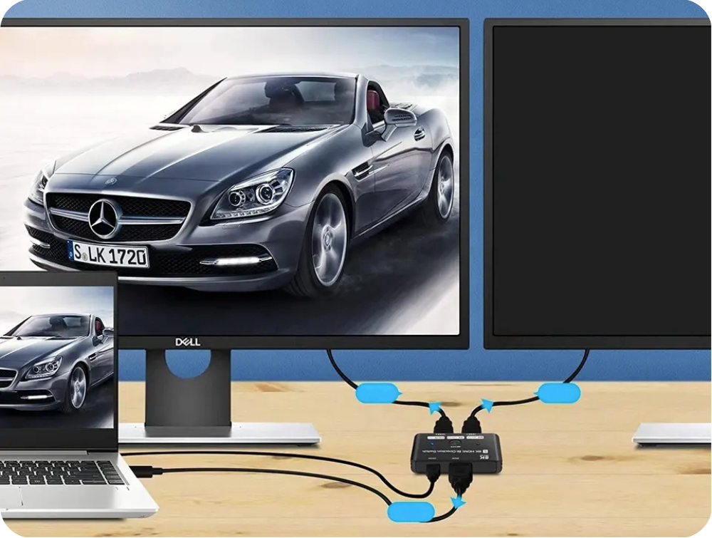 1. Dwukierunkowy przesył: Bezproblemowo przełączaj między konfiguracjami jednym przyciskiem. Wybieraj między 2 wejściami a 1 wyjściem lub 1 wejściem a 2 wyjściami (Uwaga: oba wyświetlacze nie mogą działać jednocześnie). Idealne dla użytkowników, którzy potrzebują więcej portów HDMI 2.1 w swoim telewizorze lub monitorze. Przełącznik zapewnia brak opóźnień i utraty jakości.