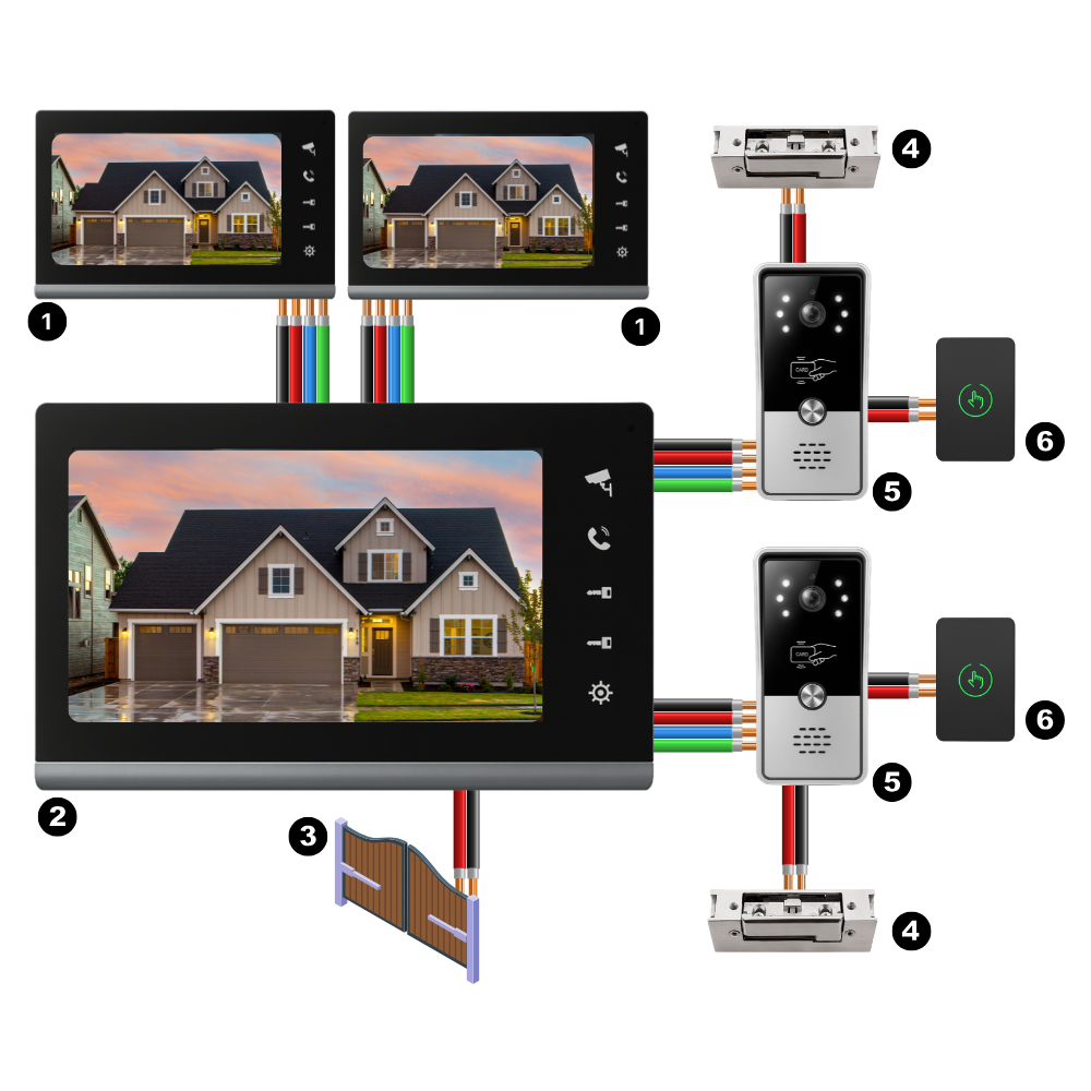 Cały system działa na czterożyłowej linii (zasilanie + audio-wideo). Wystarczy poprowadzić ją od jednostki głównej do paneli zewnętrznych i – w razie potrzeby – dalej do dodatkowych monitorów.