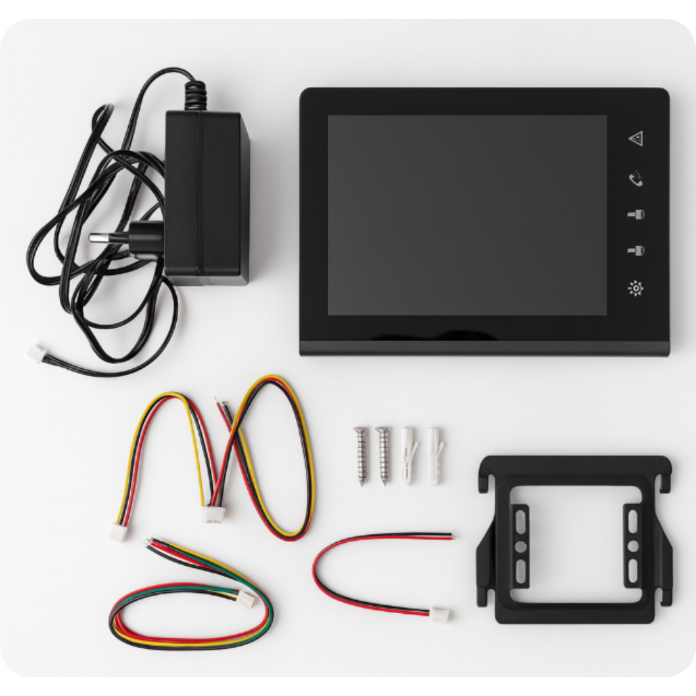 - Jednostka główna (2) – ekran 7″, z którego rozmawiasz z gościem, otwierasz furtkę/bramę i ustawiasz system.