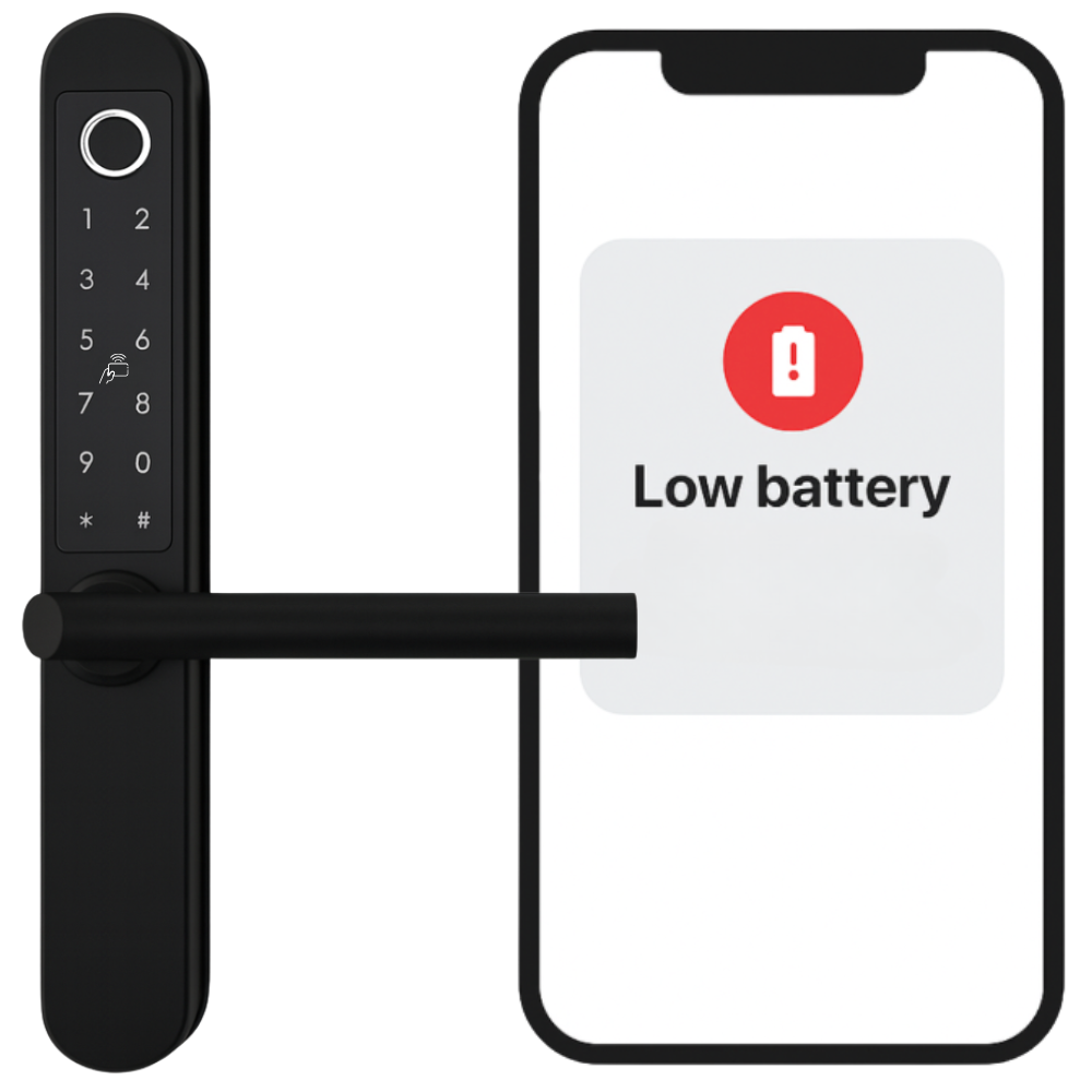 Zamek jest wyposażony w alarm niskiego poziomu baterii, co pozwala na bieżąco monitorować stan zasilania. Na aplikację zostanie wysłane powiadomienie o niskim stanie poziomu baterii ≥20%, ≥10%, ≥5% a na samym zamku zaświeci się czerwone światło po jego odblokowaniu (3 mignięcia).