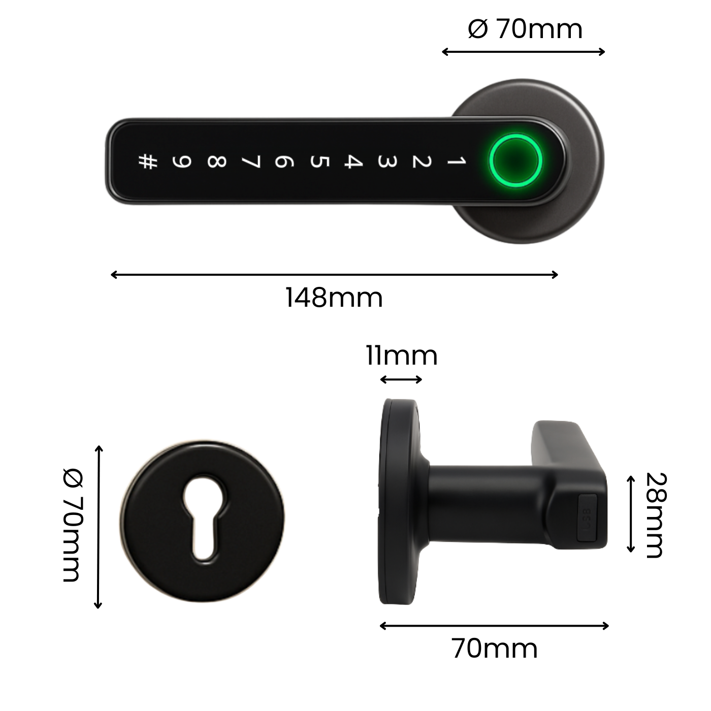 - Projekcja/odstęp od powierzchni drzwi do końca trzpienia/klamki: 70 mm.