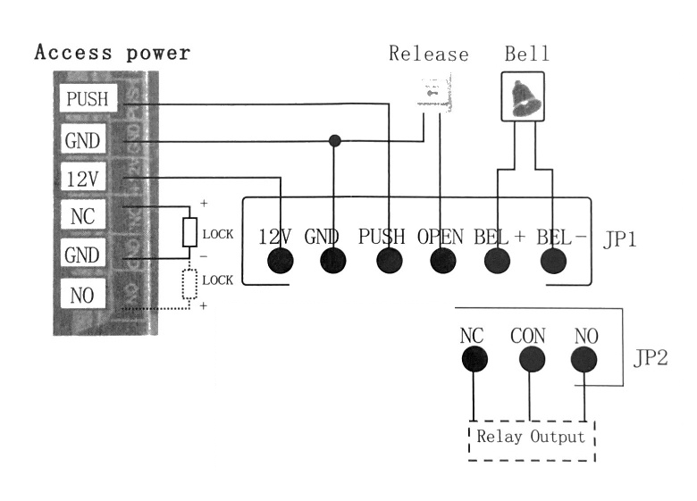 Urządzenie wyposażone zostało w dwa zestawy zacisków podłączeniowych: JP1 oraz JP2, które umożliwiają pełną integrację z systemem kontroli dostępu, elektrozaczepem, automatyka bramy oraz dzwonkiem.