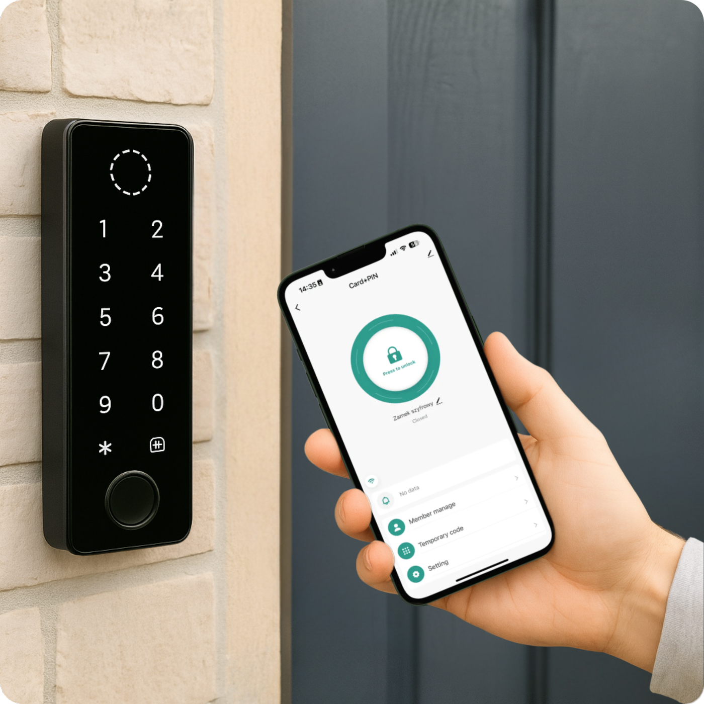 Łączy się z aplikacją Tuya Smart, umożliwiając zdalne otwieranie elektrozaczepu, podgląd historii otwarć i wygodne programowanie użytkowników z poziomu smartfona.