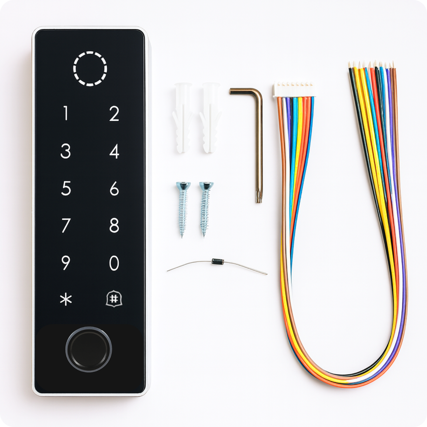 - Tryby otwierania: Odcisk palca, Karta ID: 125 kHz, Kod PIN (4–6 cyfr), Karta Master