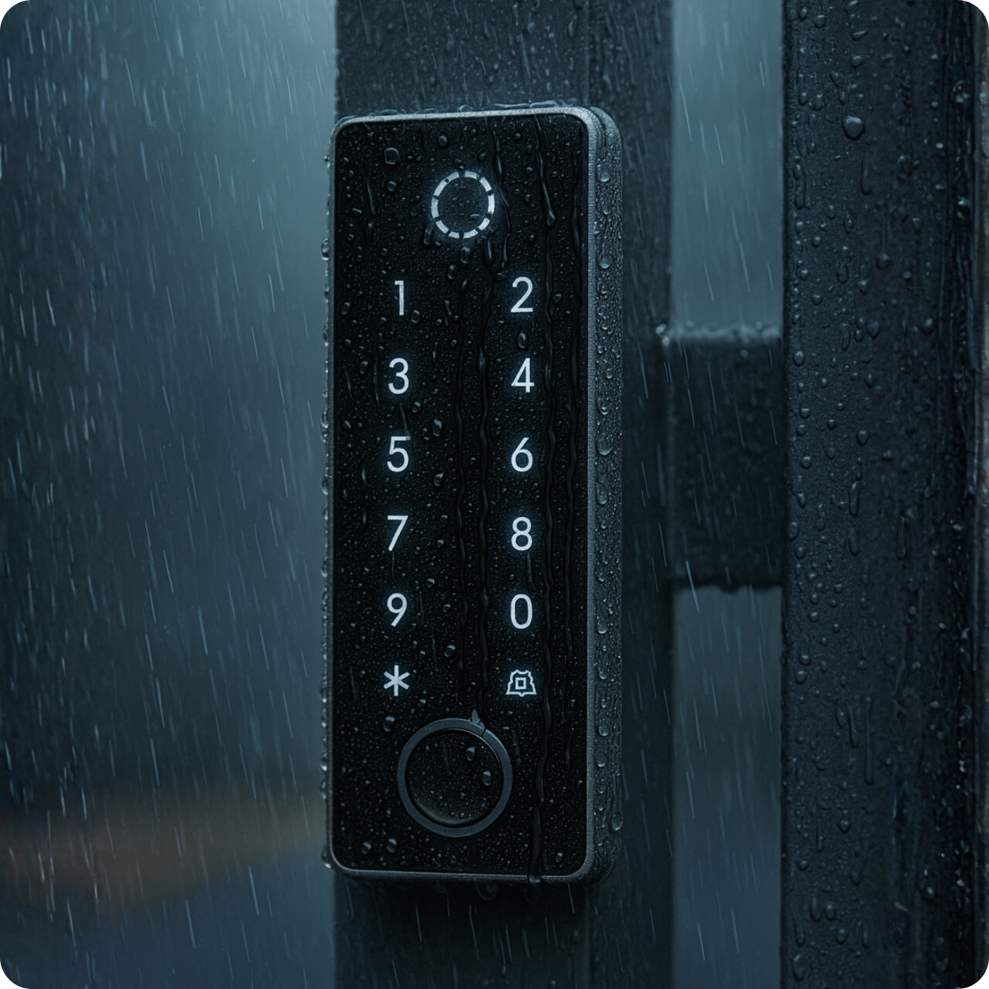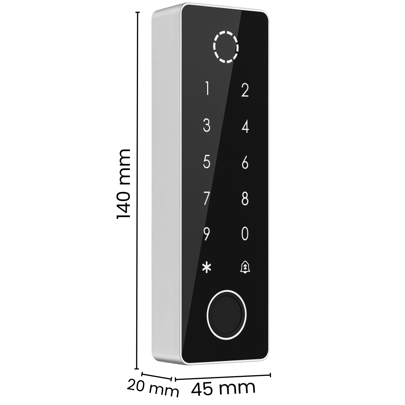 Wyposażony w wodoodporną obudowę IP66, pojemnościowy czytnik linii papilarnych, dotykową klawiaturę i obsługę kart 125 kHz.