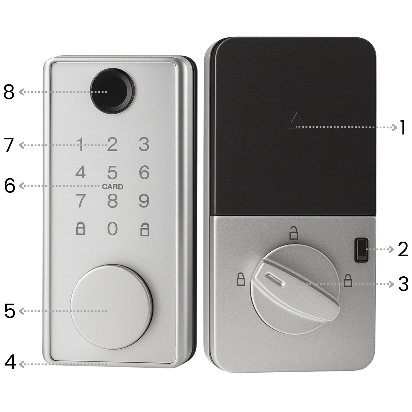 - Quick Lock (blokada zewnętrzna): Naciśnij przycisk blokady, aby natychmiast zamknąć zamek