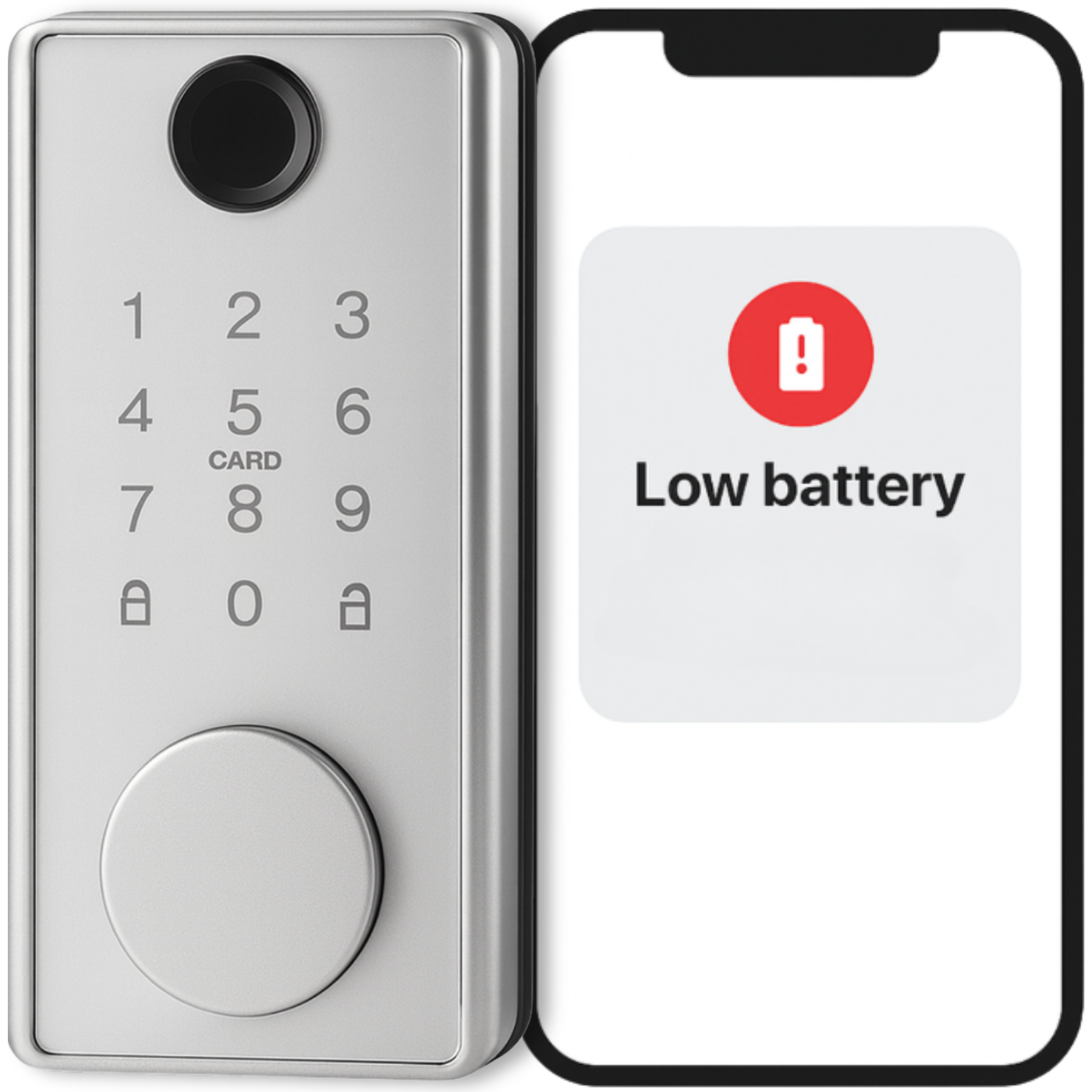 Zamek jest wyposażony w alarm niskiego poziomu baterii, co pozwala na bieżąco monitorować stan zasilania. Na aplikację zostanie wysłane powiadomienie o niskim stanie poziomu baterii ≥20%, ≥10%, ≥5% a na samym zamku zaświeci się czerwone światło po jego odblokowaniu (3 mignięcia).