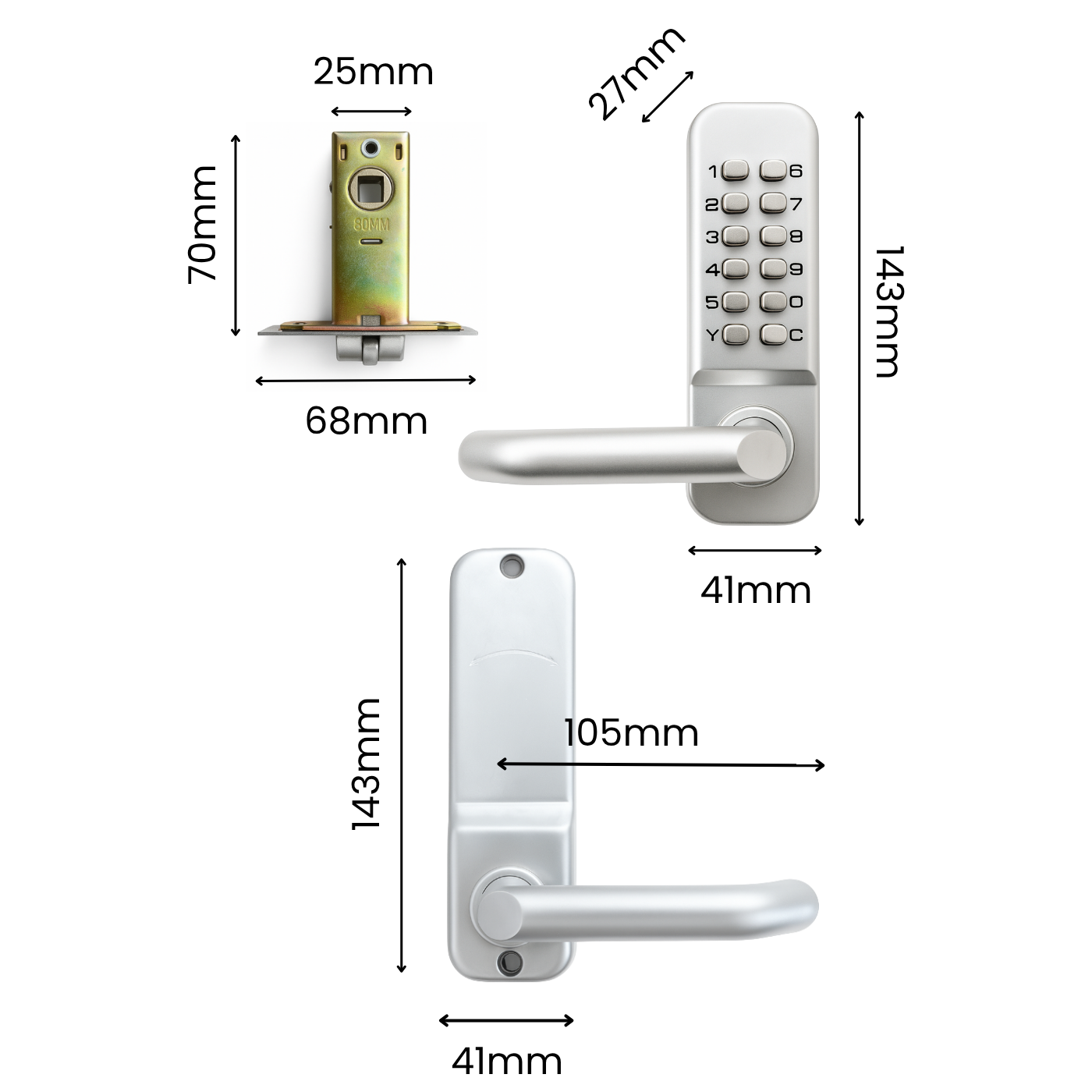 - Zamek wpuszczany: długość: 70 mm; szerokość płytki czołowej: 25 mm; głębokość korpusu: 68 mm; rozstaw: 50 mm