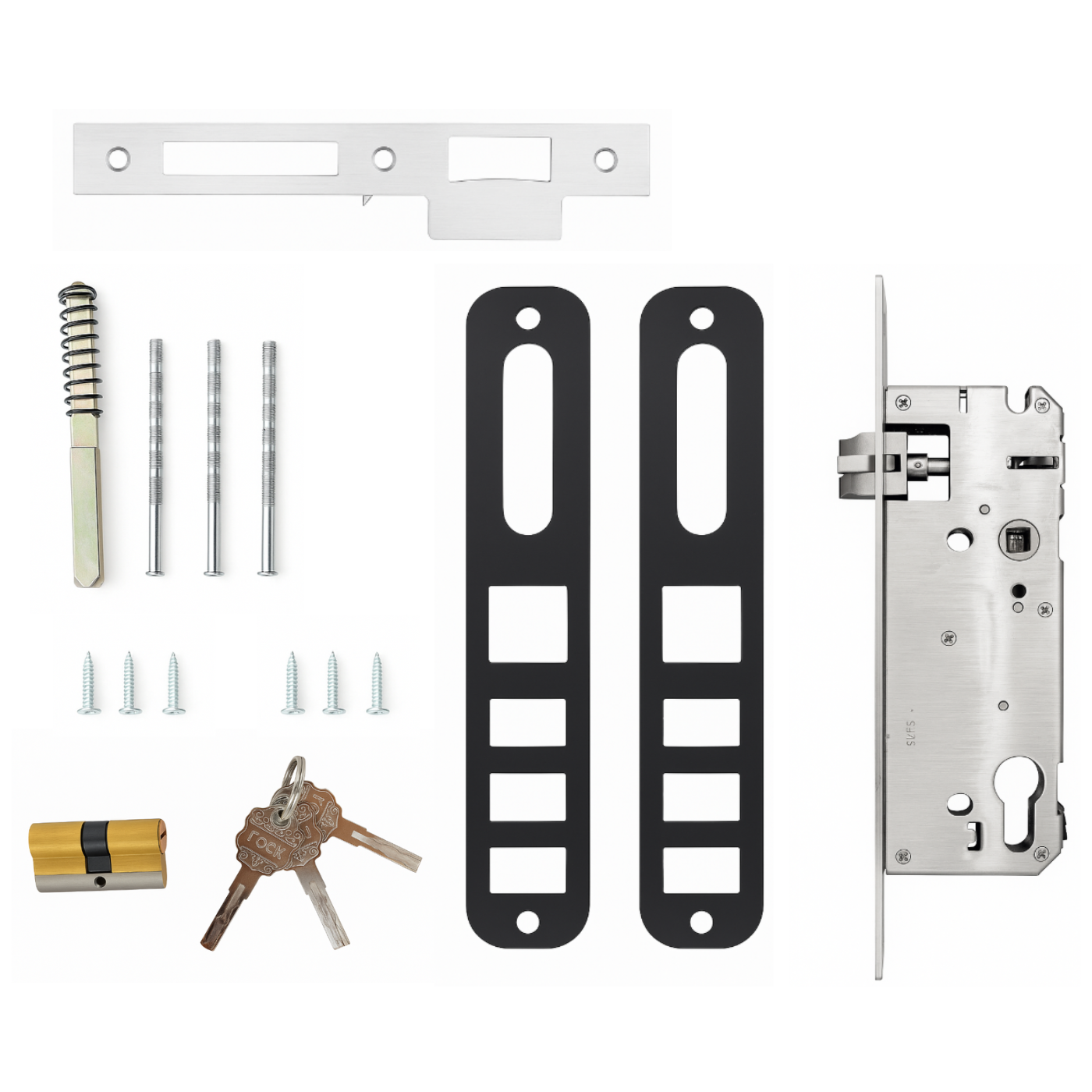 - 1x Zamek wpuszczany z rozstawem 85/50mm (nie trzeba korzystać z tego w zestawie, można użyć swój zamontowany już w drzwiach zamek)