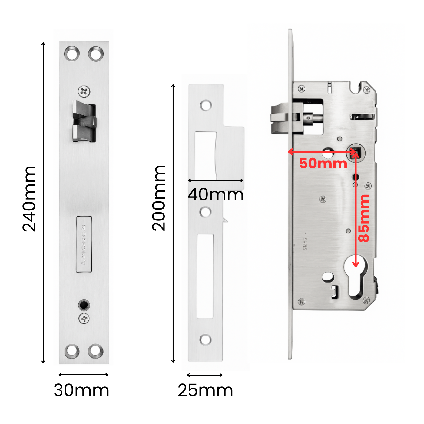- Zamek wpuszczany: długość: 240 mm; szerokość płytki czołowej: 30 mm; głębokość korpusu: 68 mm; rozstaw: 50 mm